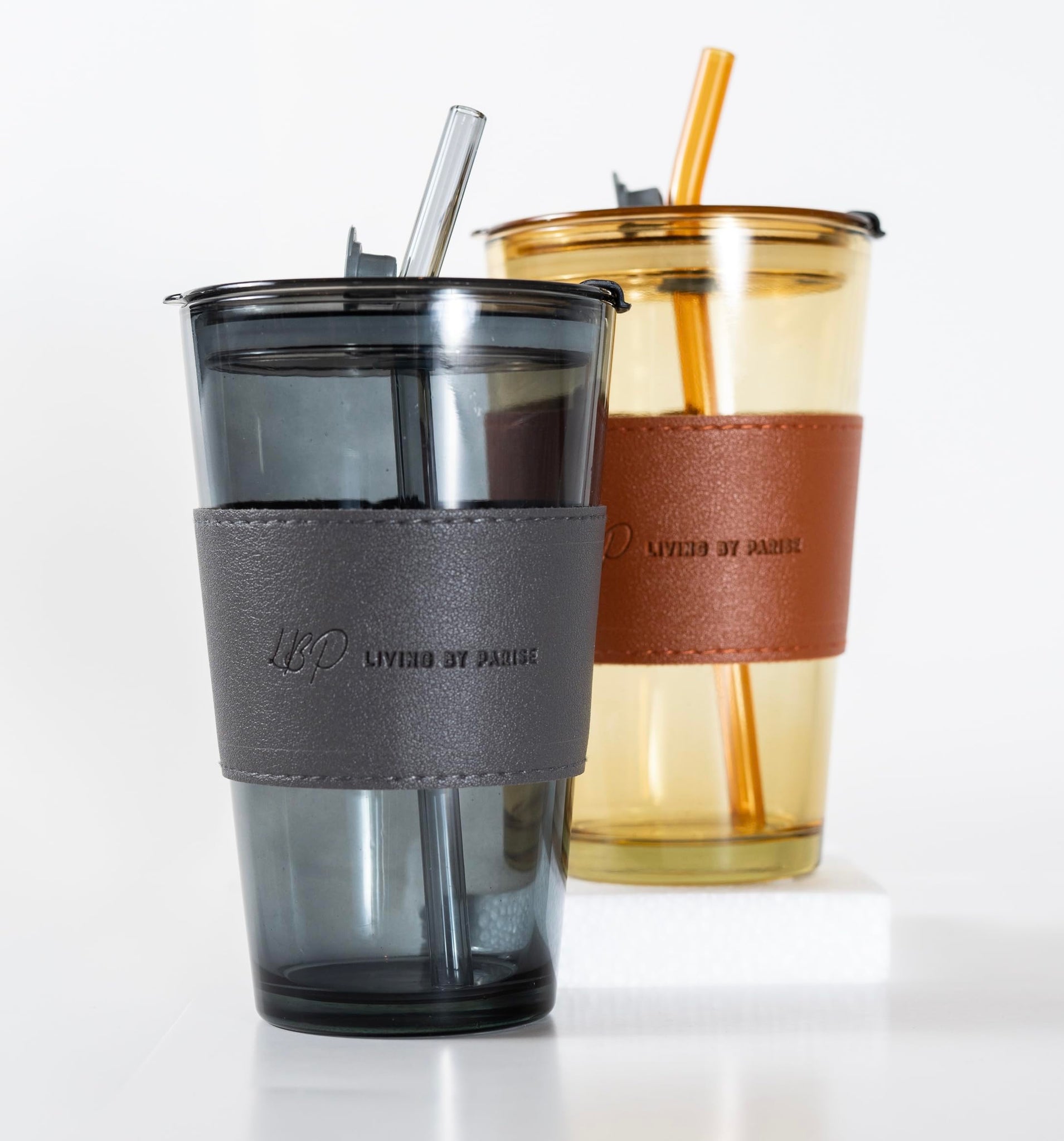 Product details of 450ml Glass Tumbler with Straw, Lid & Leather Sleeve, Leather Sleeve With Protective Leather Sleeve, Reusable Glass Coffee Tumbler